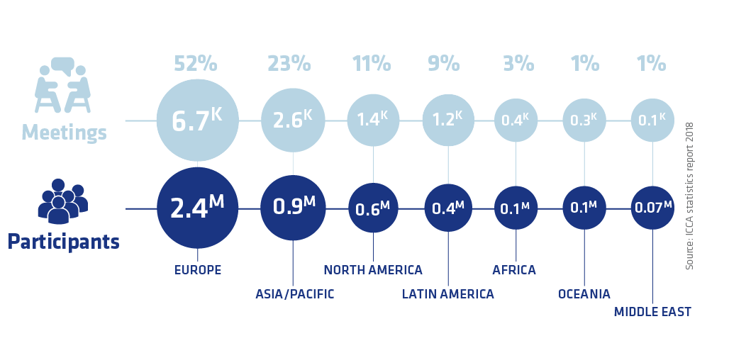 Europe enjoys an excellent position as a meeting destination. As well as offering outstanding value for money and a superb infrastructure, the region profits from its first-class know-how in many areas of science and business. ICCA statistics show that associations from around the world choose Europe as a great place to meet, share knowledge, drive innovation and connect with people and ideas. European countries host nearly 2.4 million business visitors a year as the number one worldwide meeting destination for association meetings. The number of meetings held is nearly three times as high as in Asia and the Middle East as the second largest market.