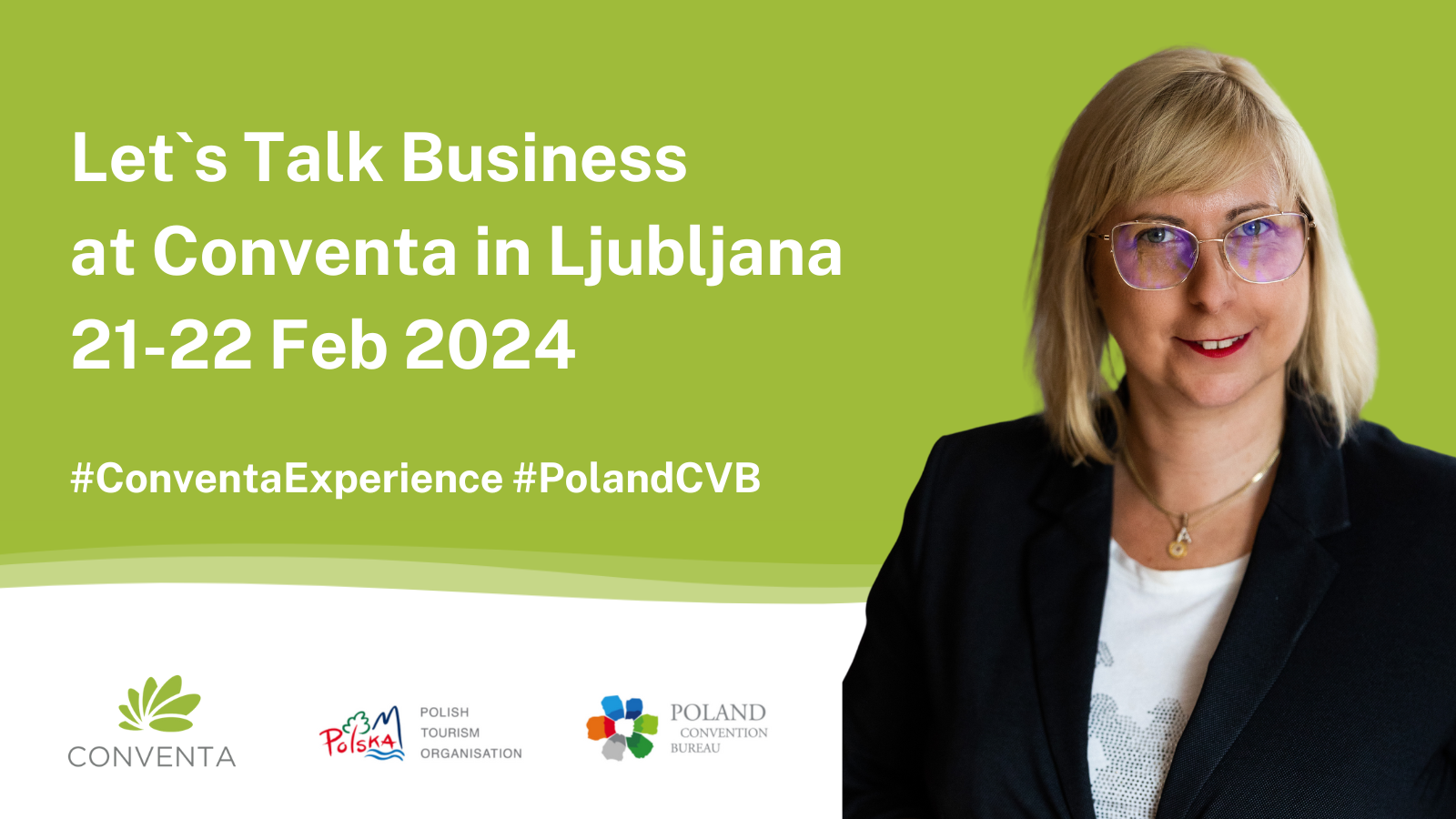 Poland Convention Bureau is delighted to share that we'll be participating for the second time at the CONVENTA boutique trade show in New Europe in Ljubljana on February 21-22, 2024. This is your chance to connect with us and explore partnership opportunities. Arrange your meetings and meet the head of the Polish Convention Bureau - Aneta Ksiazek.