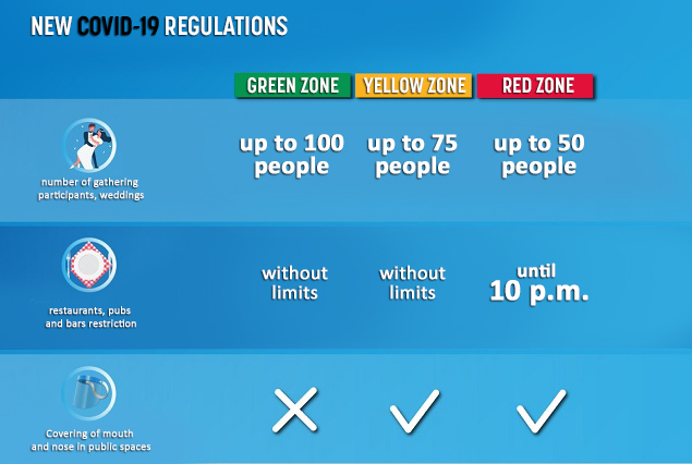New regulations setting a limit on the number of gathering participants will come into force in mid-October. As a result, events staged in green zones will be aimed at max. 100 guests, and in the yellow zones - at max. 75 attendants. Up to 50 people continue to be allowed at gatherings in red zones, which will now also be affected by an additional restriction, with restaurants, pubs and bars closing at 10pm. Covering of mouth and nose in public spaces, up to now obligatory only in red zones, will be required also in yellow zones.