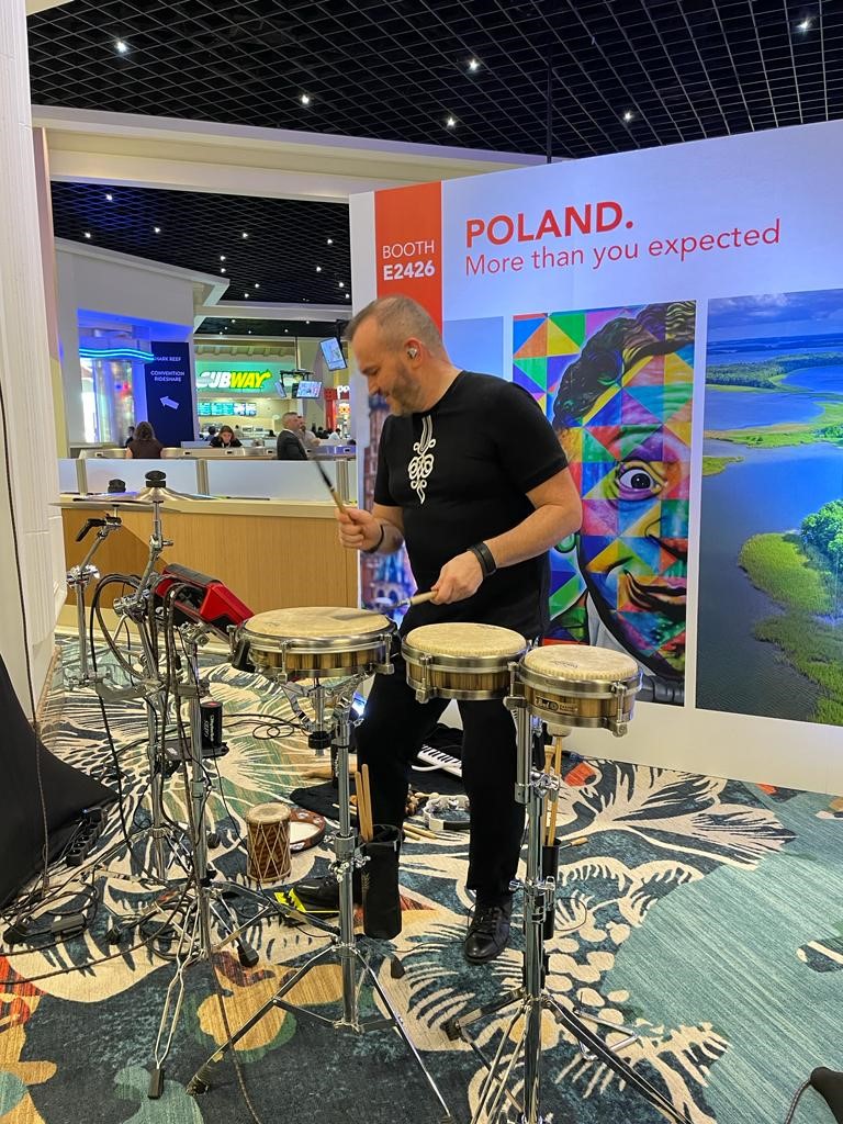 To entice visitors to the Polish booth, Musical Mornings were organized, featuring two mini concerts of jazz music performed by session and concert drummer Mariusz Mocarski, who has collaborated with numerous artists representing various musical styles.