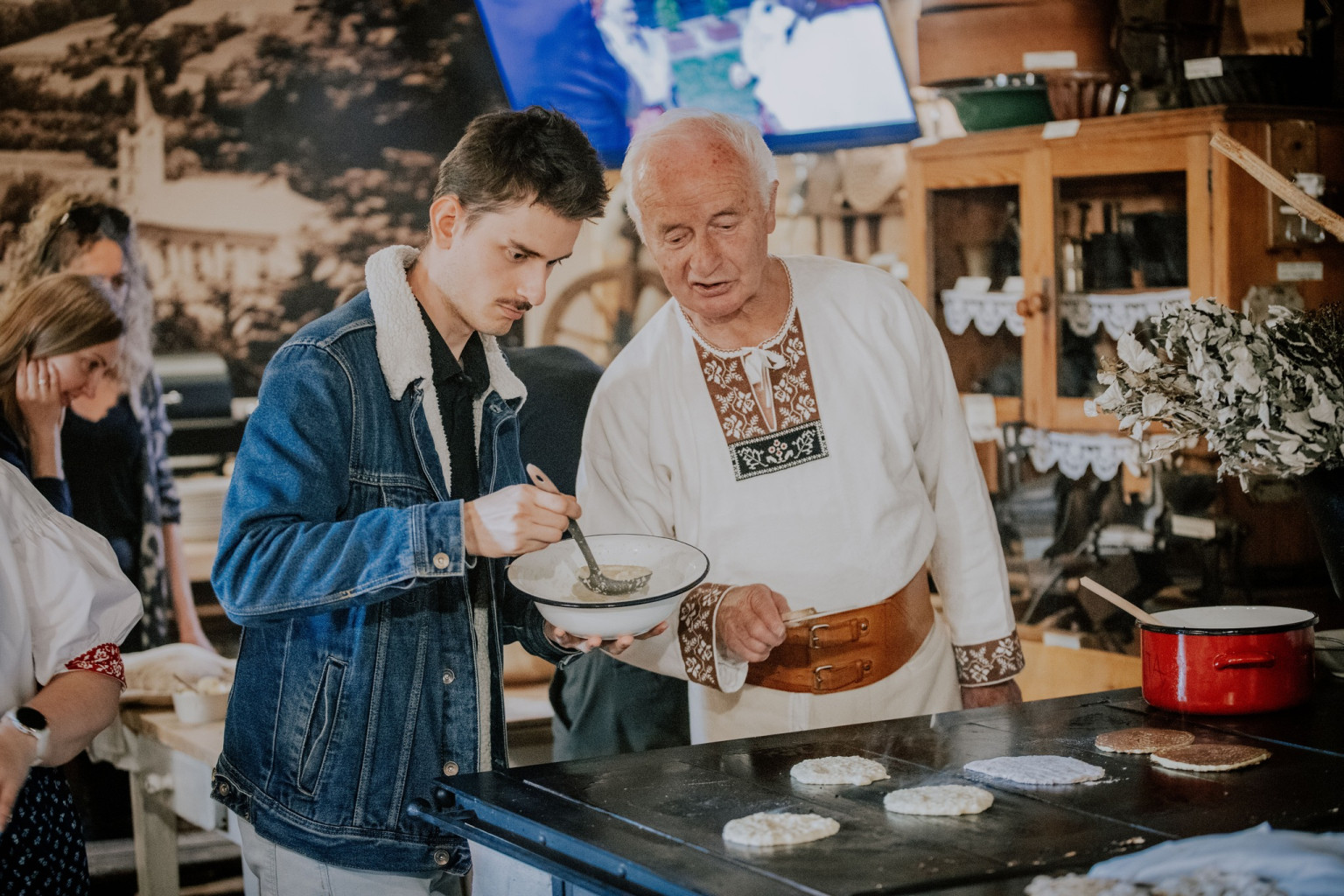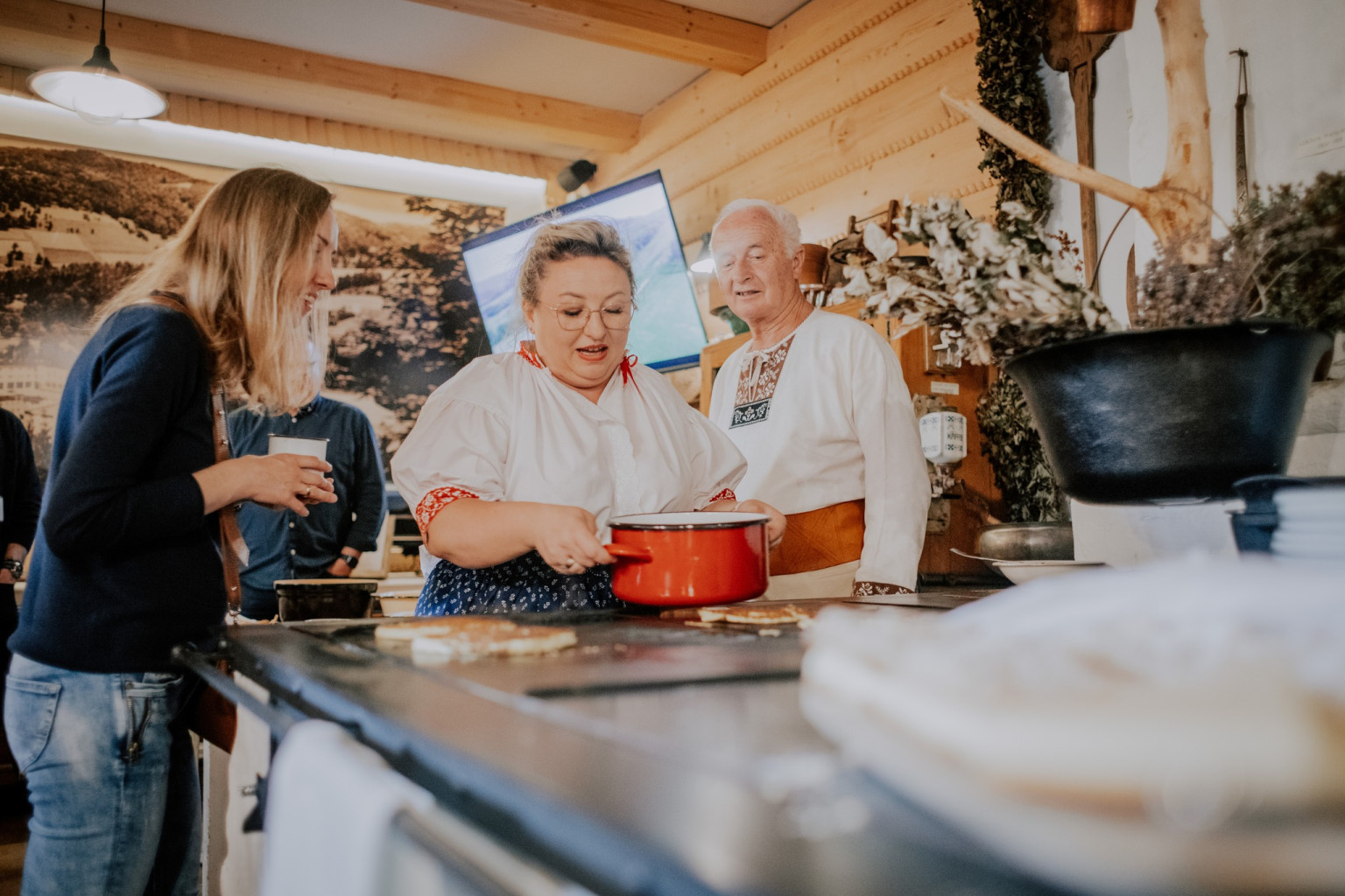 The final part of the programme was a visit to the Olympic Champion Jaś and Helenka's Cottage in Wisła (Chata Olimpijczyka Jasia i Helenki). The owner, Maria Pietruszka, shared the culinary passions of her family, now in its third generation of Wisła women. Guests were treated to regional dishes that made a significant impression, including kapuśnica, a soup of the Cieszyn Silesian highlanders made from broth and sauerkraut juice. After touring the museum of regional cuisine in Wisła, "The Ancestors' Capital" (Muzeum Wiślańskiej Kuchni Regionalnej „Stolica Pradziadków”) participants took part in culinary workshops where they could bake pancakes and flatbreads on a griddle.