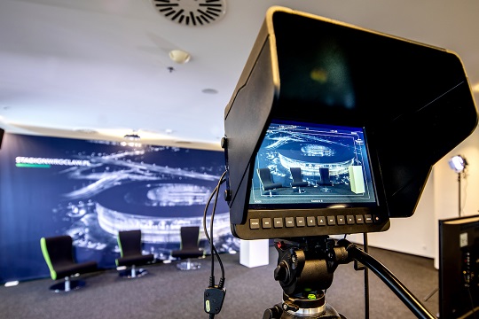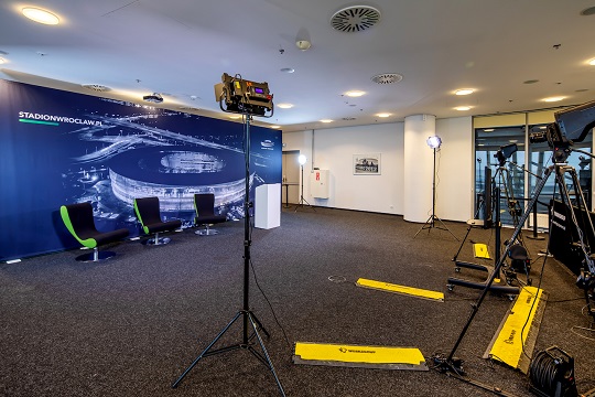 A ready Television Studio Wroclaw Stadium (164m2) localized in Euro room, level 3, is the ideal space to realize all sorts of conferences, product presentations, webinars, training online or a virtual studio realization using green screen technique. In our proffessional and state of the art studio we have separate space for the public (45m2), with live preview possibility. Apart from the option to rent the ready studio in Euro room, there is the option of conducting a broadcast in other spaces of the Stadium.