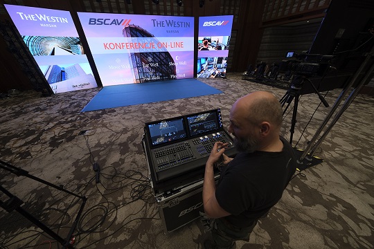 Meet our innovative and professional Online Studio located in the very heart of the business centre of Warsaw. The studio is the perfect spot to host virtual conferences, hybrid meetings and any other events. It is fully equipped with LED screen with the maximum width of 10 meters and 3,5 meters height, advanced sound system, effect and front lighting, wireless microphones, preview screens and plenty of technological possibilities which will make your online meeting even more attractive and allow fantastic interaction between both, speakers and participants.