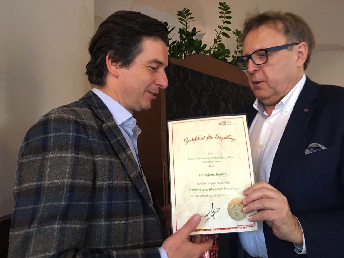 W czasie spotkania dyrektor Zagranicznego Ośrodka Polskiej Organizacji Turystycznej w Wiedniu Włodzimierz Szeląg wręczył uczestnikom podróży studyjnej na Mazury Certyfikaty poświadczające odbycie szkolenia o tematyce Warmia i Mazury.