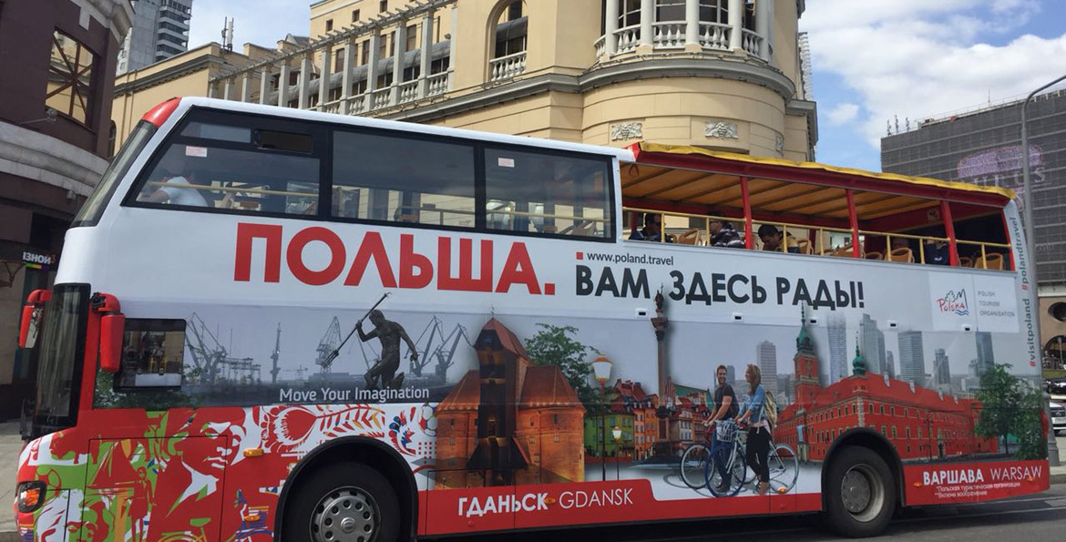 Dwa pierwsze mecze fazy grupowej Mistrzostw Świata polska reprezentacja rozegra odpowiednio na stadionach Spartak Arena w Moskwie i Kazań Arena w Kazaniu. Po ulicach tych miast jeździ autobus w barwach polskiej turystyki w wersji mundialowej z hasłem Польша. Вам здесь рады!”. Ekspresyjna reklama rzuca się przechodniom w oczy, wśród nich licznym grupom zagranicznych kibiców. Szacuje się, że podczas Mistrzostw Świata w Piłce Nożnej Rosja 2018, nad Wołgą pojawi się ponad milion fanów narodowych drużyn rywalizujących na trawiastych arenach Rosji o Puchar Świata FIFA.