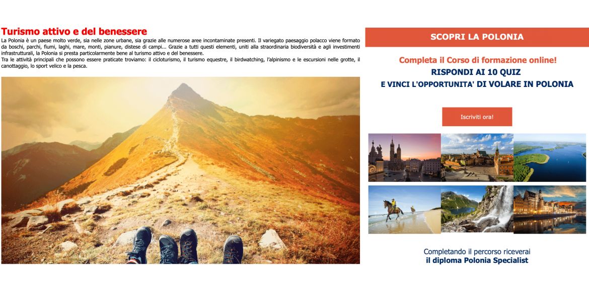 Prawie 450 agentów podróży i touroperatorów wzięło udział w pierwszym szkoleniu on-line na rynku włoskim, zorganizowanym przez Polską Organizację Turystyczną w Rzymie, prowadzonym pod tytułem „Polonia Specialist”. Warsztaty zostały zaprojektowane w innowacyjnej formule dziesięciu modułów szkoleniowych i quizów z wiedzy o Polsce.