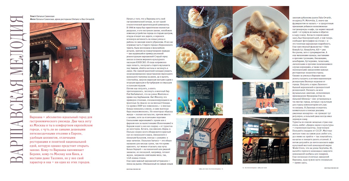 Kulinarne oblicze Warszawy to temat artykułu, jaki opublikowany został w branżowym rosyjskim czasopiśmie Restoratorchef. Prezentowane w nim gastronomiczne atrakcje stolicy Polski są efektem podróży studyjnej do naszego kraju, jaki zorganizowała Polska Organizacja Turystyczna.