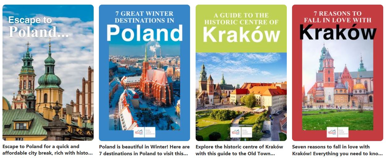 Przełom roku to kluczowy moment na brytyjskim rynku turystycznym. To właśnie w grudniu i styczniu Brytyjczycy dokonują decyzji związanych z kierunkiem podróżowania. Kamapnia na platformie Pinterest została zaplanowana na promocję turystyki miejskiej (Warszawa, Kraków oraz Gdańsk), ujętej w kontekście takich walorów jak: kuchnia lokalna, zabytki, kultura oraz UNESCO.
