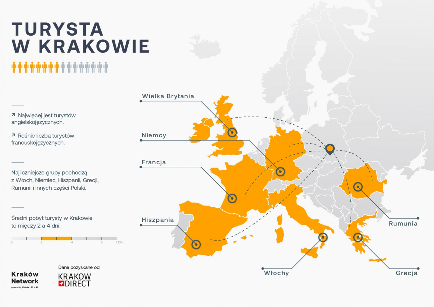 Podróżujący do Krakowa wciąż głównie reprezentują turystów anglojęzycznych, jednak szczególnie w grudniu zanotowano wzrost zainteresowania ze strony turystów francuskojęzycznych. Poza tym, najliczniejsze grupy nadal pochodzą z Włoch, Niemiec, Hiszpanii, Grecji, Rumunii oraz z innych części Polski.