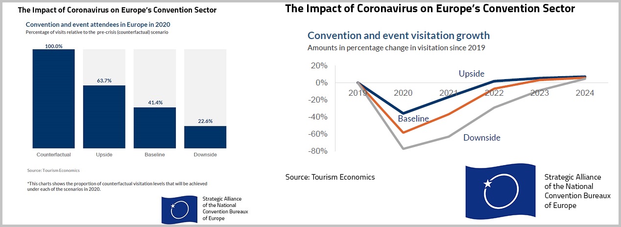 Scenariusz podstawowy zakłada odwołanie wszystkich eventów zaplanowanych w Europie pomiędzy marcem i sierpniem, pewną poprawę sytuacji we wrześniu i październiku (gdy faktycznie odbędzie się 75% wszystkich wydarzeń zaplanowanych w danym miesiącu) i powrót do normy w listopadzie. Całkowita liczba podróży w Europie w 2020 r. ma spaść o 58%. Zgodnie z modelem podstawowym, na uczestnictwo w zarówno krajowych, jak i międzynarodowych wydarzeniach wpływ w dalszym ciągu będą miały pewne negatywne nastroje, obniżając liczbę uczestników o 25% w 2021 r. i 5% w 2022 r., przed ostateczną poprawą sytuacji w 2023 r.