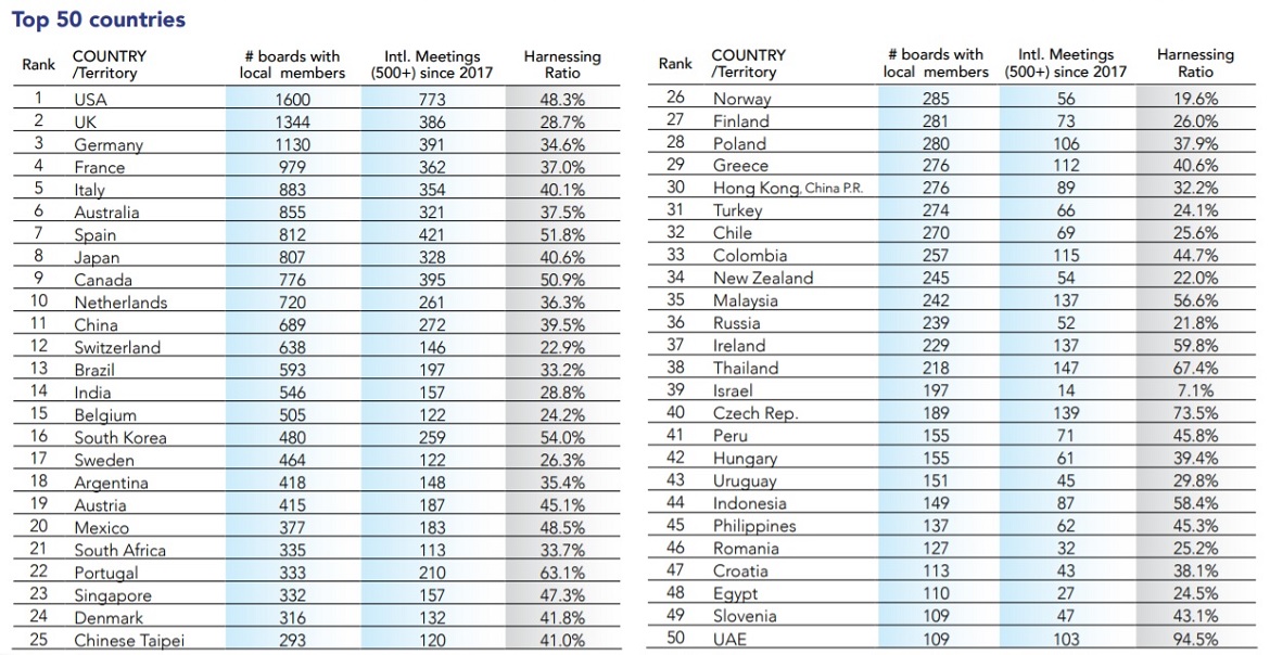 Wskaźnik wykorzystania dla 50 największych krajów pokazuje, że Zjednoczone Emiraty Arabskie mają wysoki poziom zaangażowania kapitału intelektualnego (94 proc.). Wśród krajów europejskich o stosunkowo wysokim wskaźniku wykorzystania znajdują się Czechy (73,5 proc.), Portugalia (63,1 proc.), Irlandia (59,8 proc.) i Hiszpania (51,8 proc). Kraje Azji i Pacyfiku o wysokim wskaźniku to Tajlandia (67,4 proc.), Malezja (56,6 proc.) i Korea Południowa (54 proc.). Wśród 10 krajów o bardzo wysokich wskaźnikach wykorzystania znajdują się również Kanada (50,9 proc.) i Stany Zjednoczone (48,3 proc.). Stany Zjednoczone dysponują największą ilością kapitału intelektualnego na świecie (1600 liderów) i wyraźnie odnoszą z tego faktu korzyści, realizując z sukcesem duże wydarzenia.