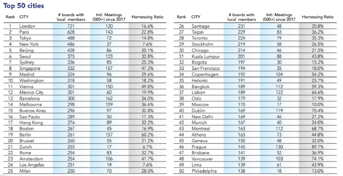 Badanie wykorzystania kapitału intelektualnego w miejscach docelowych kongresów, wykazało, iż globalnymi centrami wiedzy o silnym wpływie na międzynarodowe stowarzyszenia są: Londyn, Paryż, Tokio, Nowy Jork i Pekin. To z tych miast pochodzi aż 21 proc. światowych liderów stowarzyszeń (2751 osób).