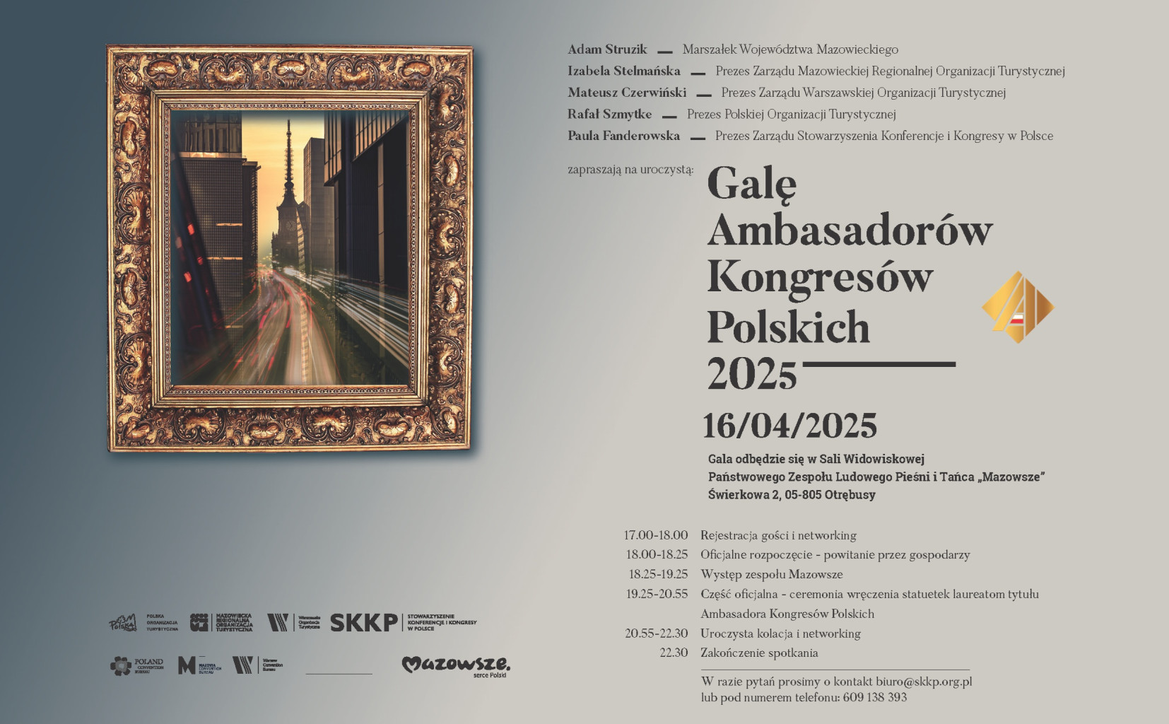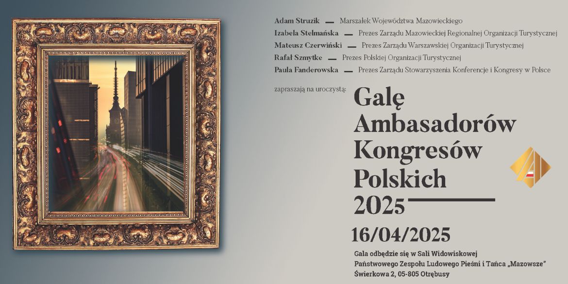 W imieniu regionalnych i lokalnych Gospodarzy: Marszałka Województwa Mazowieckiego, Mazowieckiej Regionalnej Organizacji Turystycznej - Mazovia Convention Bureau i Warszawskiej Organizacji Turystycznej - Warsaw Convention Bureau oraz organizatorów Programu AKP Polskiej Organizacji Turystycznej, Stowarzyszenia Konferencje i Kongresy w Polsce, zapraszamy na uroczystą Galę Ambasadorów Kongresów Polskich, która odbędzie w dniu 16 kwietnia 2025 roku w sali widowiskowej siedziby Państwowego Zespołu Ludowego Pieśni i Tańca „Mazowsze” im. Tadeusza Sygietyńskiego w Karolinie.
