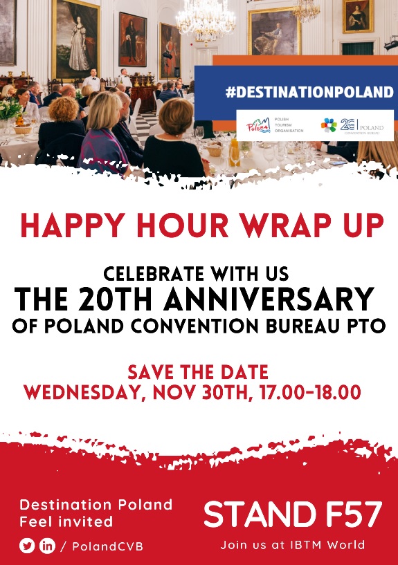 "IBTM World to jedna z dwóch najważniejszych światowych imprez targowych przeznaczona wyłącznie dla branży przemysłu spotkań, która spotyka się promując swoje produkty, destynacje oraz poszukując nowych partnerów i inspiracji do organizacji spotkań i wydarzeń. Cieszymy się, że ten wyjątkowy dla nas rok zakończymy w towarzystwie dużej grupy wystawców z Polski oraz liczymy na przybycie wielu gości zagranicznych na odbywającą się na stoisku w środę, 30 listopada br. w g. 17.00 – 18.00 happy hour, która podsumuje jubileusz 20-lecia Poland Convention Bureau POT oraz pozwoli świętować niedawne zakończenie 61. Kongresu ICCA w Krakowie" - powiedziała Aneta Książek, Główna Specjalistka w Dziale Poland Convention Bureau POT.