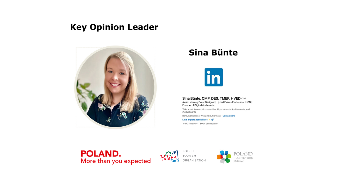 Dodatkowo współpraca obejmowała publikację postów na profilu LinkedIn Sina Bunte - key opinion leader w branży spotkań i wydarzeń. W tym publikacja wideo nagranego na polskim stoisku podczas IBTM World w Barcelonie.
