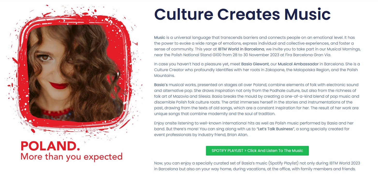 “Poland is a country rich in history, culture, and natural beauty. But that’s not all! (...) Poland is a place where modernity meets cultural heritage, offering countless opportunities to host events in historic venues, castles, palaces, and museums. Our cities boast state-of-the-art conference centres equipped with the latest infrastructure, making them perfect for hosting large gatherings. Poland is blessed with picturesque landscapes, mountains, lakes, and forests, making it an excellent location for outdoor events”' – tak rozpoczyna się wpis blogowy na stronie landingowej kampanii https://meetings.poland.travel/