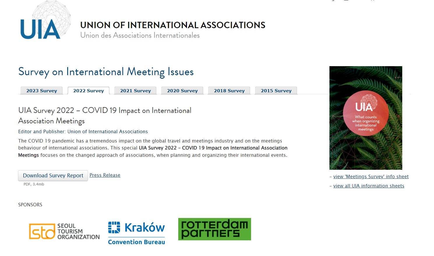 UIA (Union of International Associations) jest instytutem badawczym oraz centrum dokumentacyjnym, który od ponad 100 lat zbiera i przekazuje informacje o rynku międzynarodowych spotkań stowarzyszeń pozarządowych i organizacji międzyrządowych oraz o kierunkach i trendach w jego rozwoju. Partnerem badania „Wpływ COVID-19 na międzynarodowe spotkania stowarzyszeń” jest Kraków Convention Bureau oraz Polska Organizacja Turystyczna (Poland Convention Bureau), która także jest jedynym członkiem stowarzyszenia UIA z Polski.
