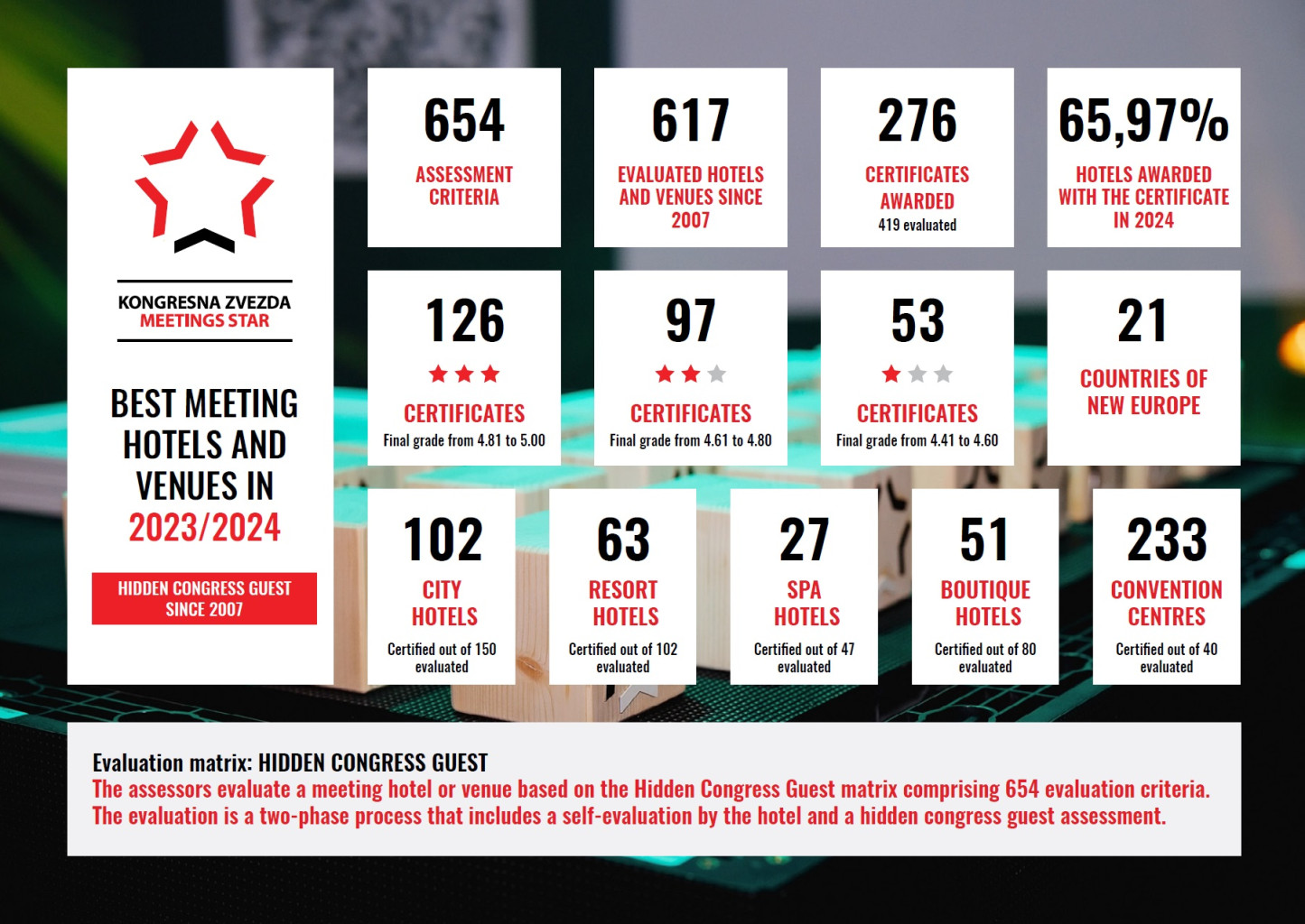 “Metodologia tajemniczych gości zapewnia obiektywną ocenę hoteli i centrów kongresowych. Podstawą naszej metodologii było oferowanie informacji, które można analizować na miejscu w oparciu o zestaw kryteriów oraz wizytę tajemniczego gościa. Nagroda Meetings Star Award oraz Ceryfikat Meetings Star stały się punktem odniesienia i swoistym przewodnikiem Michelin dla branży spotkań. Wierzę, że nasz projekt sprzyja rozwojowi całej branży spotkań. - powiedział Gorazd Čad, założyciel Meetings Star oraz redaktor naczelny Kongres Magazine.