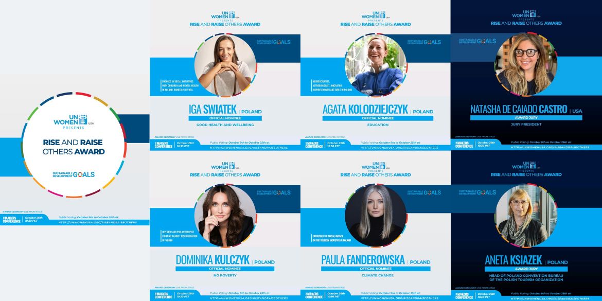 Cztery Polki zostały nominowane do prestiżowej nagrody “Rise and Raise Other Award” przyznawaną przez United Nations Women. UN Women jest agencją Organizacji Narodów Zjednoczonych zajmującą się równością płci i wzmocnieniem pozycji kobiet. Nominowane Polki to Iga Świątek, Dominika Kulczyk, Agata Kołodziejczyk i Paula Fanderowska.