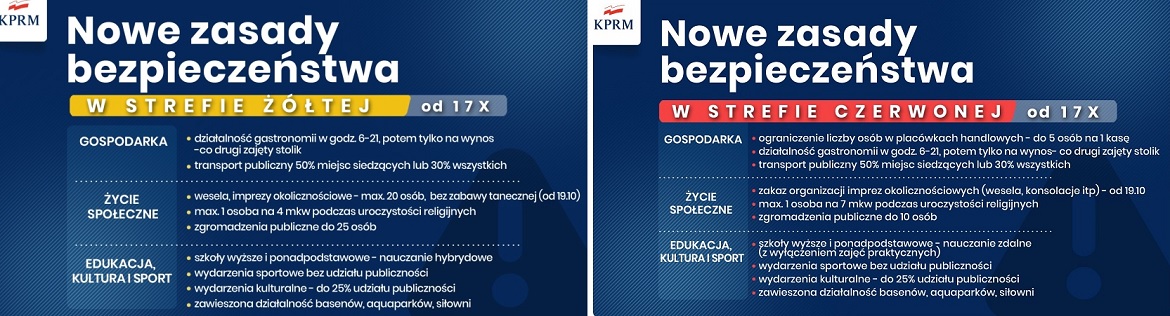 Od soboty, 17 października w strefie czerwonej, jak i żółtej obowiązują nowe zaostrzenia dotyczące bezpieczeństwa, w tym organizacji spotkań czy gastronomii. W strefie czerwonej znalazły się 152 powiaty, czyli połowa Polski. Są to przede wszystkim powiaty gęsto zaludnione, miasta i duże ośrodki miejskie.