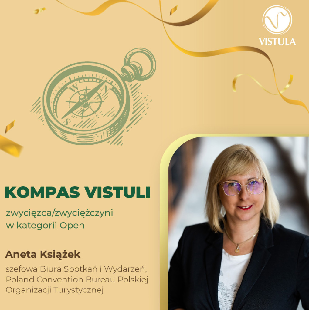 4 kwietnia 2024 poznaliśmy laureatów jubileuszowej piątej edycji konkursu Kompasy Vistuli. Wręczenie nagród odbyło się podczas gali w hotelu Novotel Warszawa Centrum, która jednocześnie było częścią polskich obchodów Światowego Dnia Przemysłu Spotkań 2024 (Global Meetings Industry Day - GMID24). Jedną z nagrodzonych osób została Aneta Książek - kierownik Biura Spotkań i Wydarzeń Polskiej Organizacji Turystycznej.