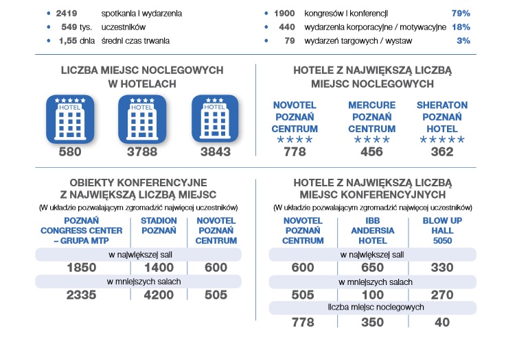 Jak wynika z Raportu Przemysłu Spotkań i Wydarzeń 2019, miniony rok był niezwykle udany dla Poznania pod względem liczby zorganizowanych spotkań, w których brało udział co najmniej 50 osób. Poznań Convention Bureau informuje, że w 2018 roku odbyło się co najmniej 2419 wydarzeń, z czego aż 1900 to wydarzenia w formule konferencji lub kongresu. Liczba ta stanowi 79 proc. wszystkich spotkań, odbywających się w minionym roku w stolicy Wielkopolski. Wydarzenia korporacyjne i motywacyjne stanowiły także znaczącą część wydarzeń i było ich 440. Odnotowano również organizację 79 targów i wystaw.