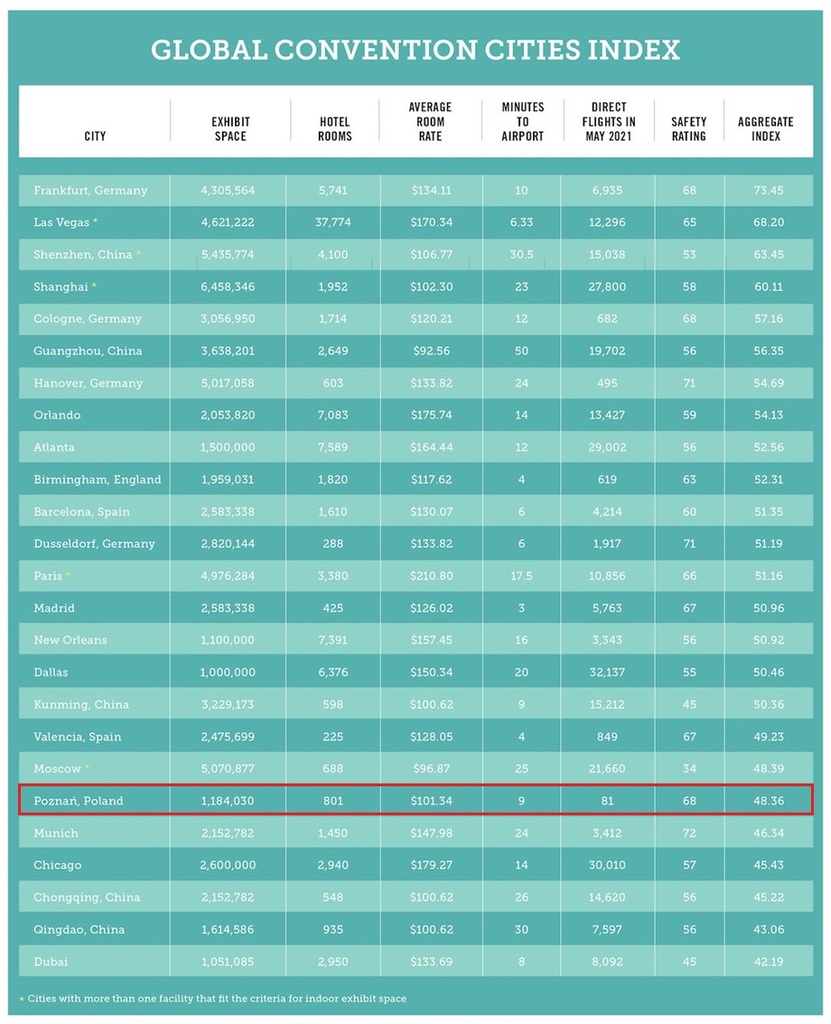 Poznań, jako jedyny reprezentant z Polski, znalazł się w Convention Cities Index (CCi) – służącym planistom wydarzeń do identyfikacji najlepszych miejsc spotkań w USA i na całym świecie, opublikowanym 15 czerwca 2021 roku przez Northstar Meeting Group.