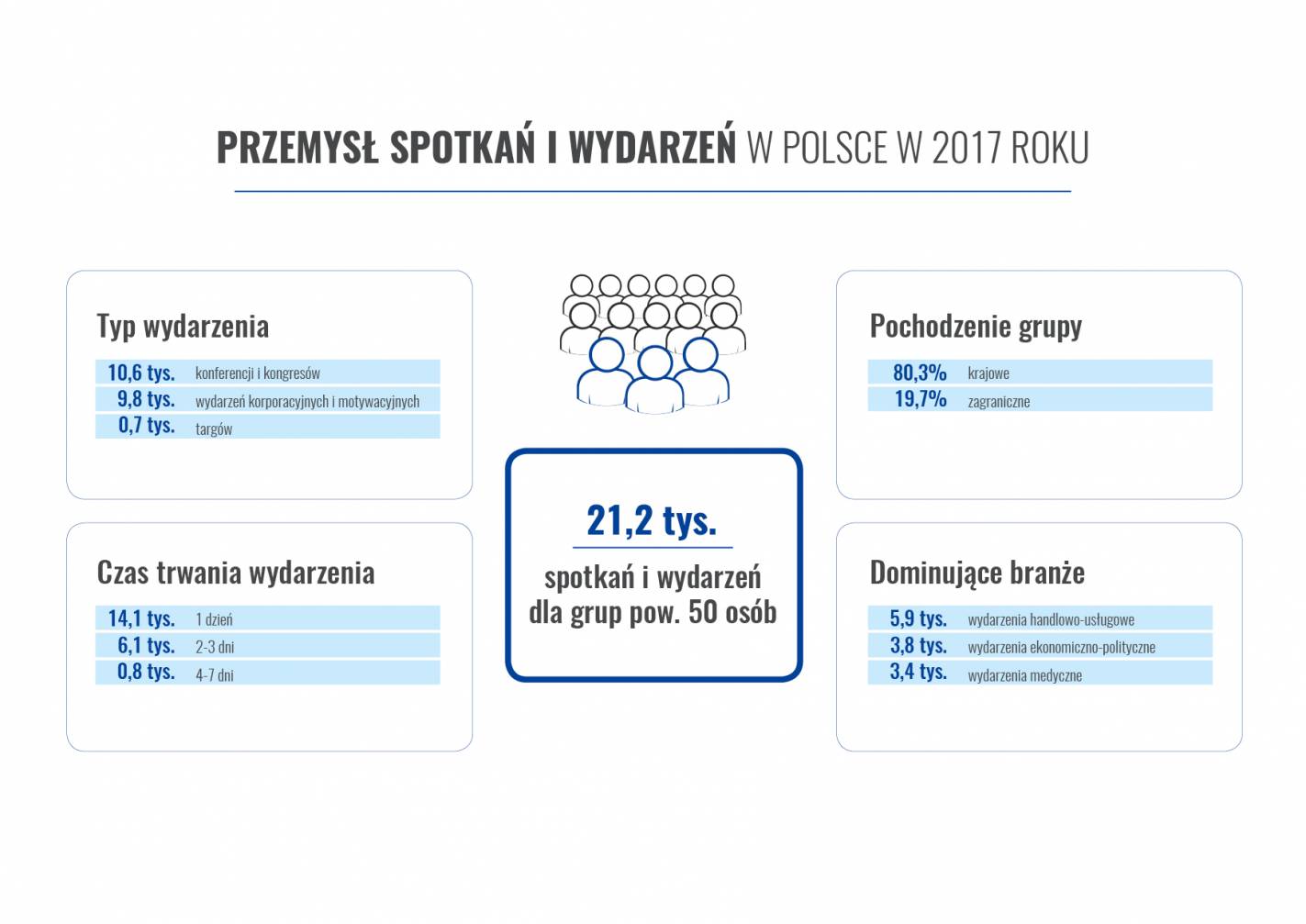 Głównym celem opracowania jest identyfikacja liczby i wielkości zorganizowanych na terenie Polski w 2017 roku spotkań i wydarzeń (m.in. społecznych, gospodarczych, biznesowych). Współpraca ze wszystkimi regionalnymi convention bureaux umożliwiła zebranie i przeanalizowanie 21,2 tysiąca spotkań i wydarzeń dla grup liczących co najmniej 50 osób. Ponad połowa z nich to konferencje i kongresy, 46,5 proc. to wydarzenia korporacyjne i motywacyjne, a nieco ponad 3 proc. to targi i wystawy. Wśród nich najwięcej, prawie 6 tysięcy, dotyczyło wydarzeń o charakterze handlowo-usługowym, 3,8 tysiąca zajmowało się tematyką ekonomiczno-polityczną, a prawie 3,5 tysiąca zagadnieniami medycznymi. Z przekazanych danych wynika, iż ponad 95 proc. wydarzeń zorganizowanych w Polsce w 2017 roku trwało nie dłużej niż 3 dni.