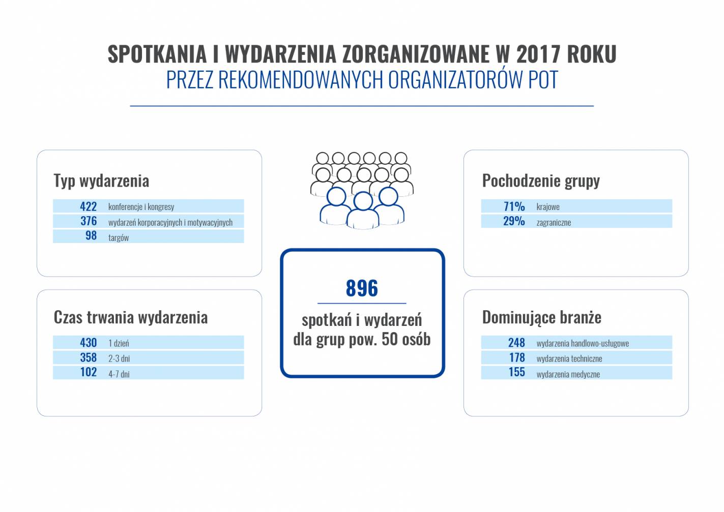 Analogicznie do ww. danych zostały opracowane dane przekazane do PCB POT przez Rekomendowanych Organizatorów Kongresów i Podróży Motywacyjnych, którzy w 2017 roku zorganizowali 896 wydarzeń dla grup liczących co najmniej 50 osób i tym samym obsłużyli 950 484 uczestników. Wyniki potwierdzają, że rekomendowane firmy skupiają się głównie na organizacji konferencji i kongresów (47 proc.) oraz wydarzeń motywacyjnych i korporacyjnych (42 proc.). Targi i wystawy stanowiły tylko 11 proc. wszystkich wydarzeń. Dominującymi branżami są handlowo-usługowa (28 proc. wydarzeń), techniczna (20 proc.) i medyczna (17 proc.).