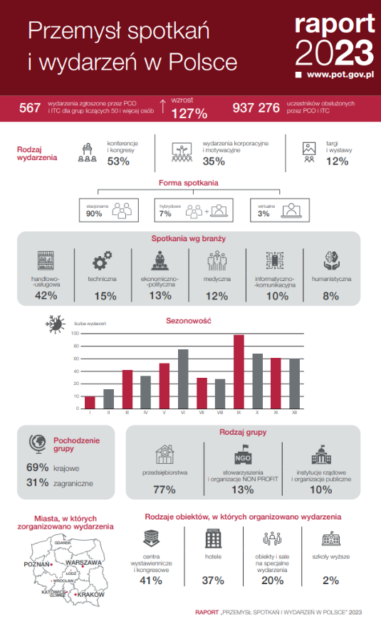 Jak co roku, we współpracy z miejskimi i regionalnymi convention bureaux, rekomendowanymi organizatorami kongresów i podróży motywacyjnych oraz międzynarodowymi organizacjami i stowarzyszeniami, Poland Convention Bureau Polskiej Organizacji Turystycznej (PCB POT) opracowało raport „Przemysł spotkań i wydarzeń w Polsce 2023” stanowiący podsumowanie osiągnięć branży spotkań z 2022 roku.