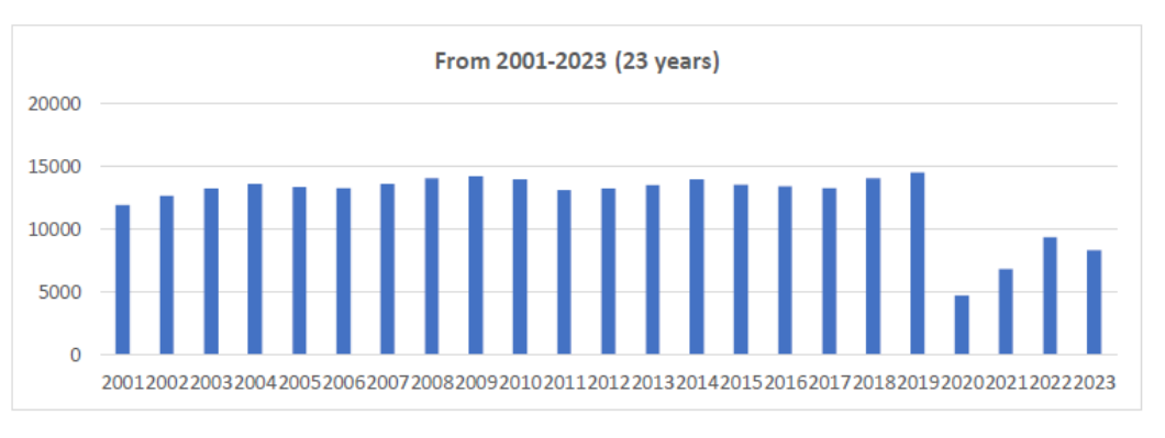 Raport, obejmujący spotkania odbywające się na całym świecie w 2023 roku, nie tylko podkreśla aktualne trendy, ale także analizuje dane z ostatnich dwóch dekad, obejmujących lata 2004–2023. Długoterminowa perspektywa pozwala na szczegółowe zrozumienie zmian i rozwoju wzorców spotkań międzynarodowych, odzwierciedlając szerszy wpływ pandemii na działalność stowarzyszeń globalnych. Liczba spotkań stowarzyszeń międzynarodowych w latach 2001-2023, według lat, przedstawiona jest poniżej.