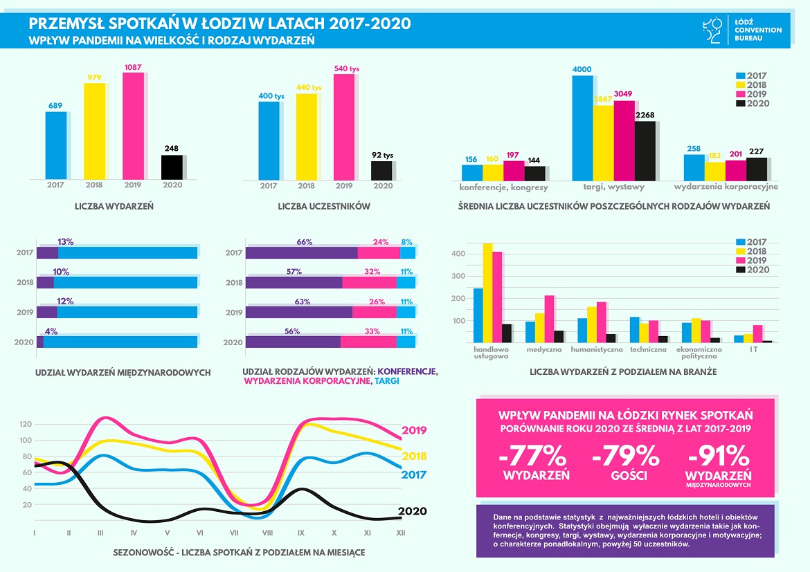 W latach 2017-2020 udział poszczególnych rodzajów wydarzeń pozostał właściwie bez zmian. Konferencje i kongresy stanowiły około 60% wszystkich spotkań, a wydarzenia korporacyjne i motywacyjne około 30%, targi i wystawy 11% wszystkich wydarzeń, choć ich udział w ogólnej licznie uczestników jest zdecydowanie największy. Również bez większych zmian kształtuje się liczba poszczególnych wydarzeń z podziałem na branże. Najwięcej organizuje się wydarzeń o tematyce handlowo-usługowej. Dalej jest branża medyczna i humanistyczna, techniczna, ekonomiczno-polityczna, a na końcu branża IT.