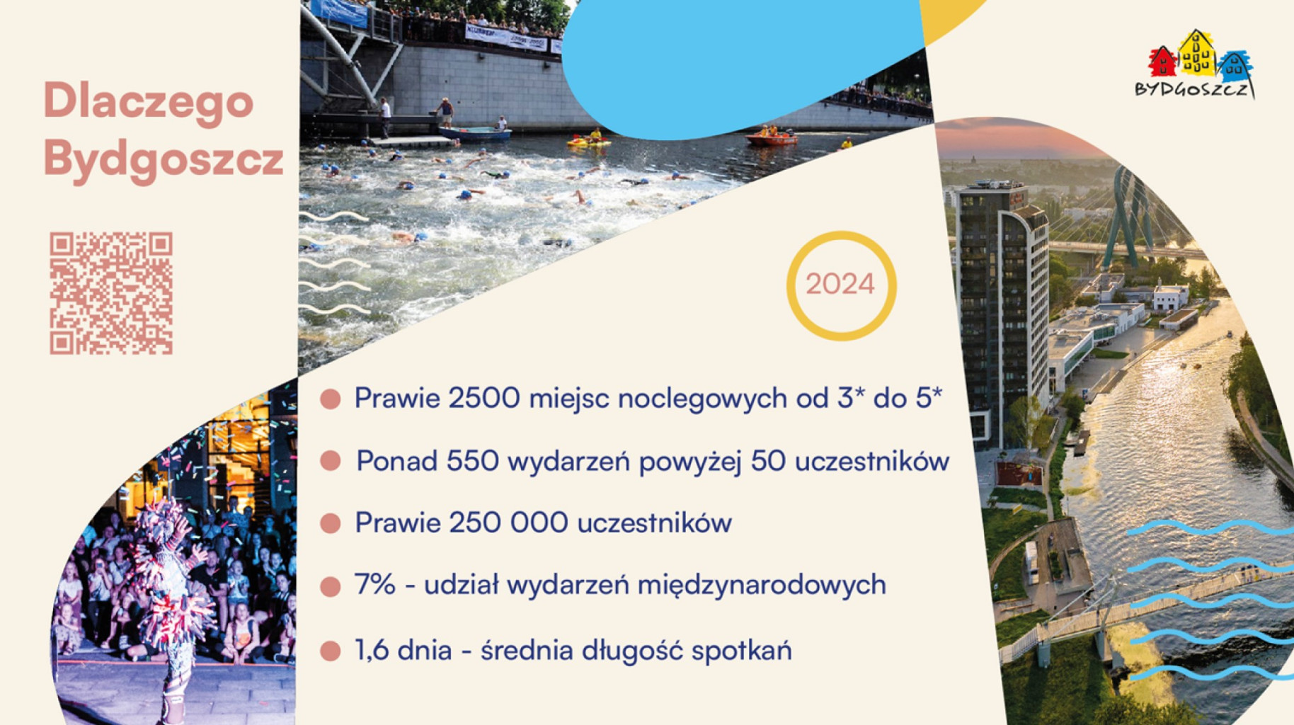 Polecamy również artykuł Przemysł Spotkań w Bydgoszczy - wzrost i trendy. Z danych zawartych w 15. edycji raportu „Przemysł Spotkań i Wydarzeń w Polsce”, przygotowanego przez Polską Organizację Turystyczną - Poland Convention Bureau we współpracy z branżą, wynika, że w 2023 roku w mieście zorganizowano o 17% więcej wydarzeń dla grup liczących 50 i więcej osób niż w roku poprzednim.