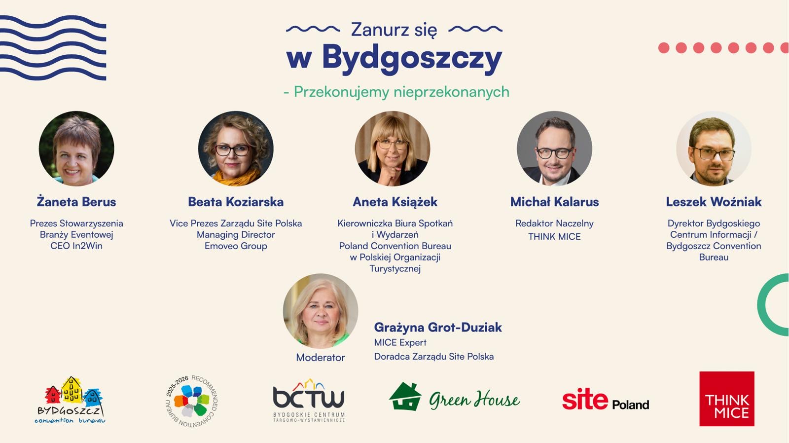 Centralnym punktem programu będzie panel dyskusyjny „Zanurz się w Bydgoszczy. Przekonujemy nieprzekonanych”, moderowany przez uznaną ekspertkę rynku MICE - Grażynę Grot-Dudziak. W gronie panelistów znajdą się m.in.: