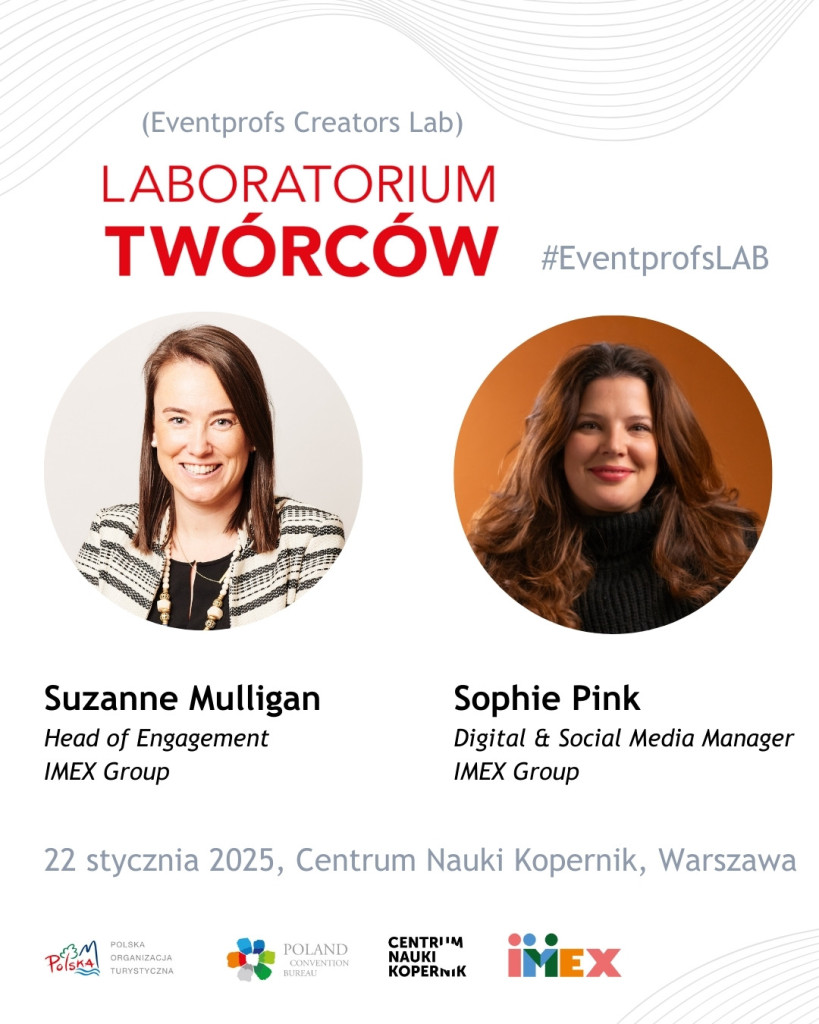 W dniu 22 stycznia 2025 roku Warszawa gościła przedstawicieli zespołu IMEX Group: Suzanne Medcalf Mulligan, Sophie Pink oraz Willa Duffielda. Wizyta odbyła się na zaproszenie Polskiej Organizacji Turystycznej – Poland Convention Bureau (POT PCB) i obejmowała wystąpienia eksperckie podczas „Laboratorium Twórców” w Centrum Nauki Kopernik.