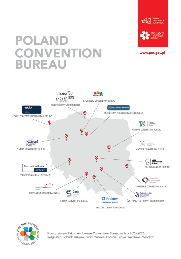 Część polskich convention bureax otrzymało tytuł Rekomendowanego Convention Bureau na lata 2025-2025 w ramach programu rekomendacji Biura Spotkań i Wydarzeń Polskiej Organizacji Turystycznej. Wyróżnione biura mogą posługiwać się tytułem i logo. Regulamin rekomendacji biur convention znajduje się na dole strony.